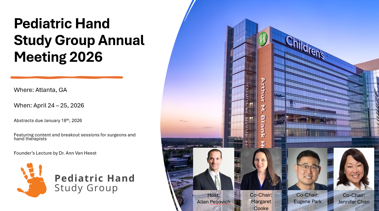 Please save the date for the 2026 Pediatric Hand Study Group (PHSG) Annual Meeting, a unique gathering dedicated to advancing knowledge, collaboration, and care in the field of pediatric hand and upper extremity. Building on the legacy of past events, this year’s meeting will bring together leading surgeons, therapists, researchers, and healthcare professionals who are committed to pioneering advancements and sharing insights. Together, let’s continue the tradition of innovation and collaboration that has defined PHSG meetings throughout the years.